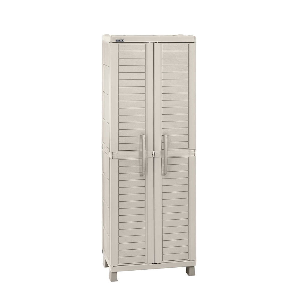 Armario Multiusos, con 3 entrepaños ajustables que resisten hasta 25 Kg cada uno y división central que permite almacenar de la mejor forma los elementos de aseo del hogar . Fácil de armar, mover y limpiar. Con la resistencia y beneficios del plástico. Excelente capacidad interior, con orificio para uso de candado para mayor seguridad. De apariencia moderna y elegante. Ideal para interiores y exteriores. Beneficios Manijas verticales. Mejor agarre y diseño. 3 Entrepaños regulables. Resiste hasta 25 kg por entrepaño. Fácil de mover. Fácil de armar.