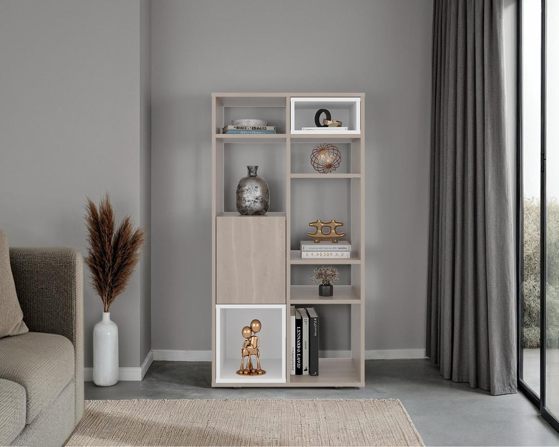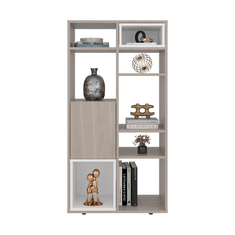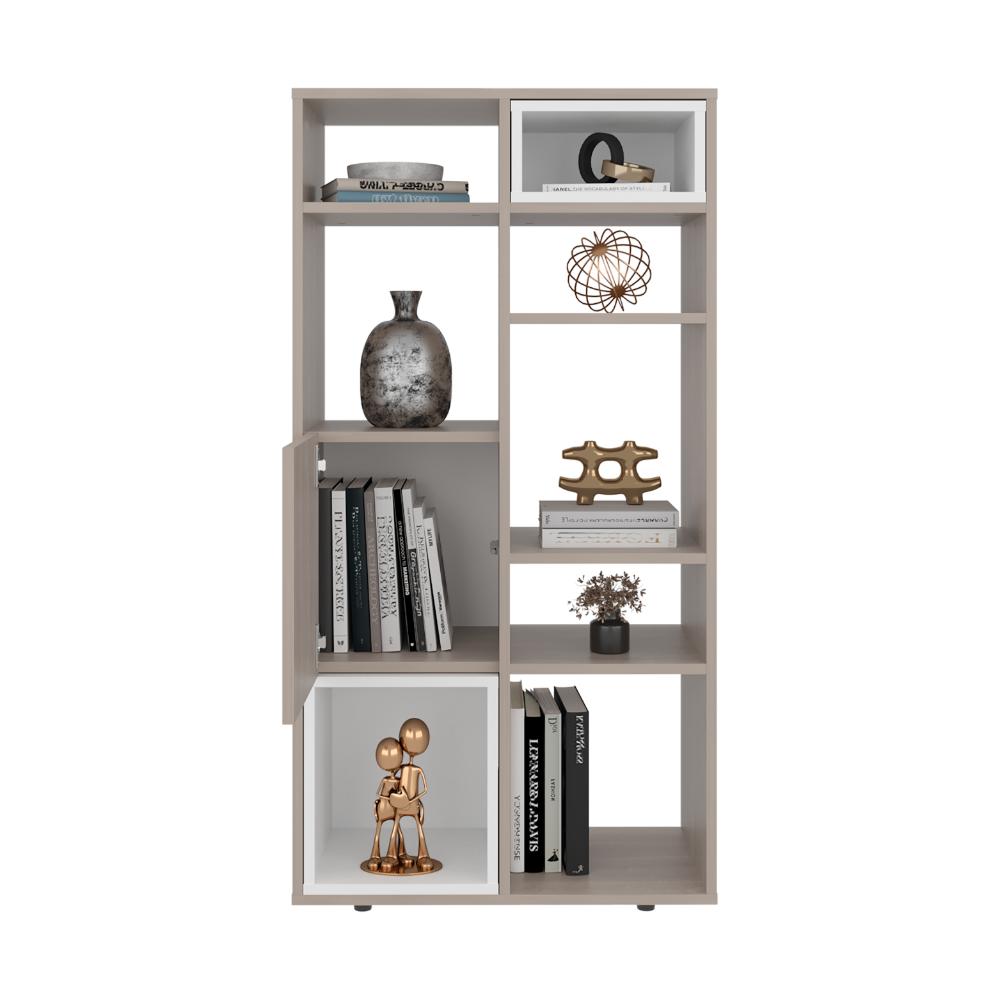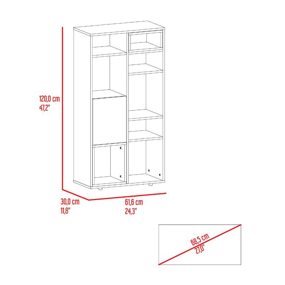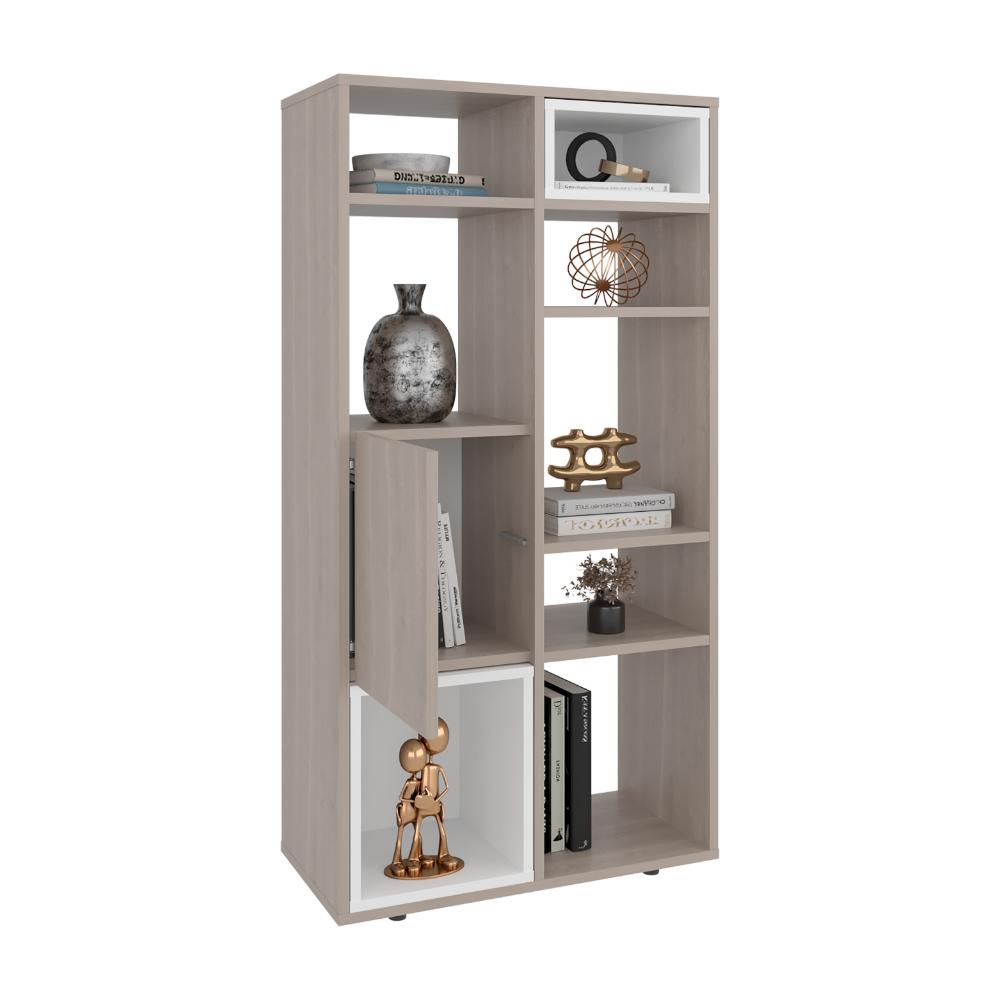 Biblioteca, con espacio para ubicar objetos decorativos, 1 puerta abatible, gran capacidad de almacenamiento y es de facil instalación.