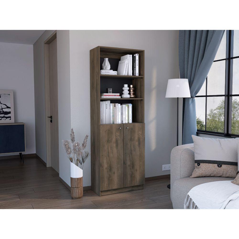 Biblioteca, con cinco entrepaños para ubicar libros y elementos decorativos y dos puertas abatibles.