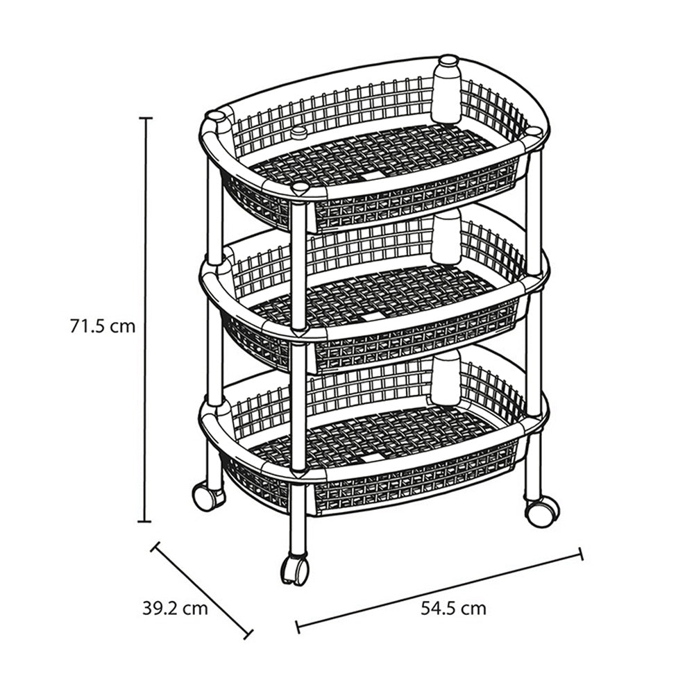 Canasta móvil ovalada que incluye tres niveles para organizar. Tiene rodachinas. Fácil de armar, no requiere herramientas. Ideal para organizar en casa todo tipo de objetos. No se oxida y es fácil de limpiar. Úsala en cocina, baños, cuartos de niños, como organizador auxiliar. Es tejida y permite oxigenar los productos o alimentos que guarde.