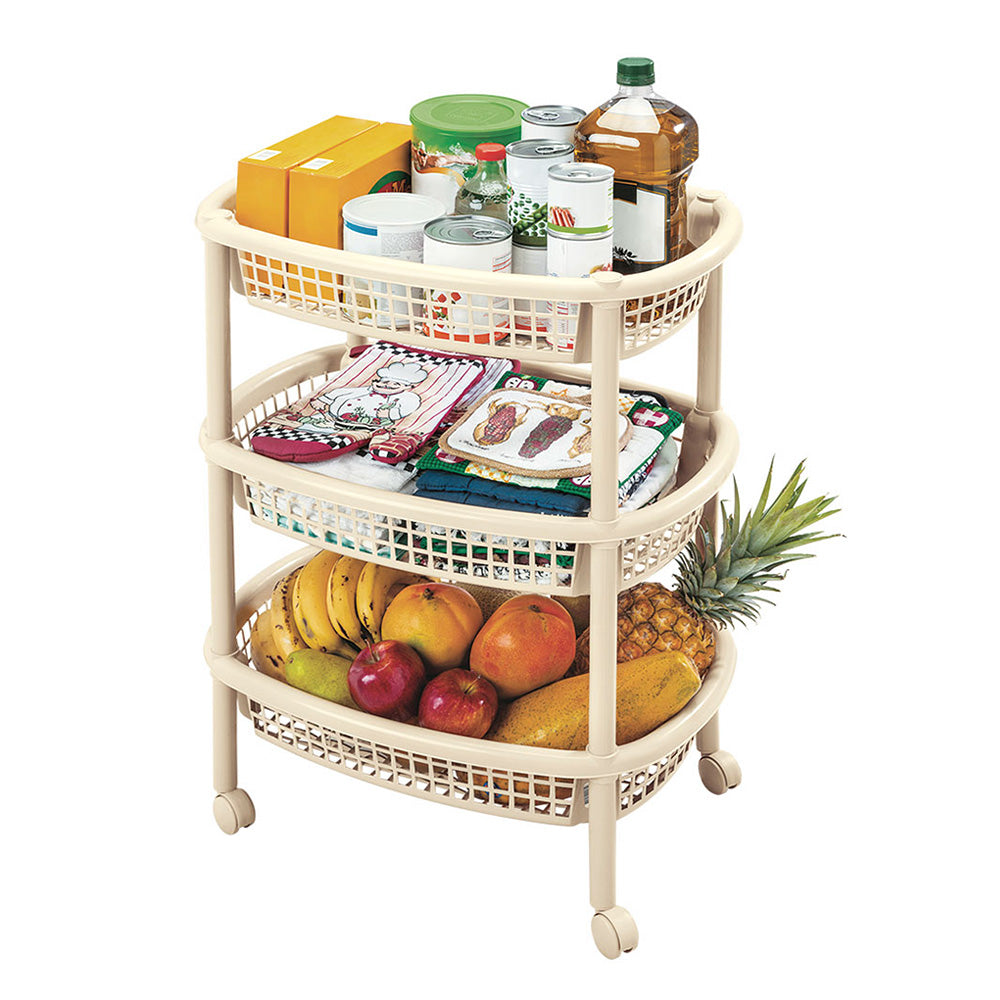 Canasta móvil ovalada que incluye tres niveles para organizar. Tiene rodachinas. Fácil de armar, no requiere herramientas. Ideal para organizar en casa todo tipo de objetos. No se oxida y es fácil de limpiar. Úsala en cocina, baños, cuartos de niños, como organizador auxiliar. Es tejida y permite oxigenar los productos o alimentos que guarde.