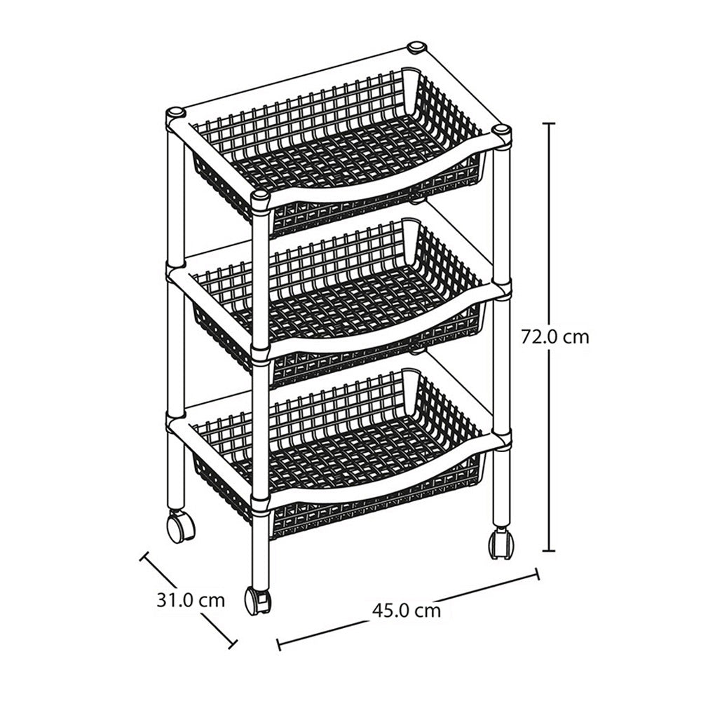 Canasta móvil rectangular que incluye tres niveles para organizar. Tiene rodachinas. Fácil de armar, no requiere herramientas. Ideal para organizar en casa todo tipo de objetos. No se oxida y es fácil de limpiar. Úsala en cocina, baños, cuartos de niños, como organizador auxiliar. Es tejida y permite oxigenar los productos o alimentos que guarde.