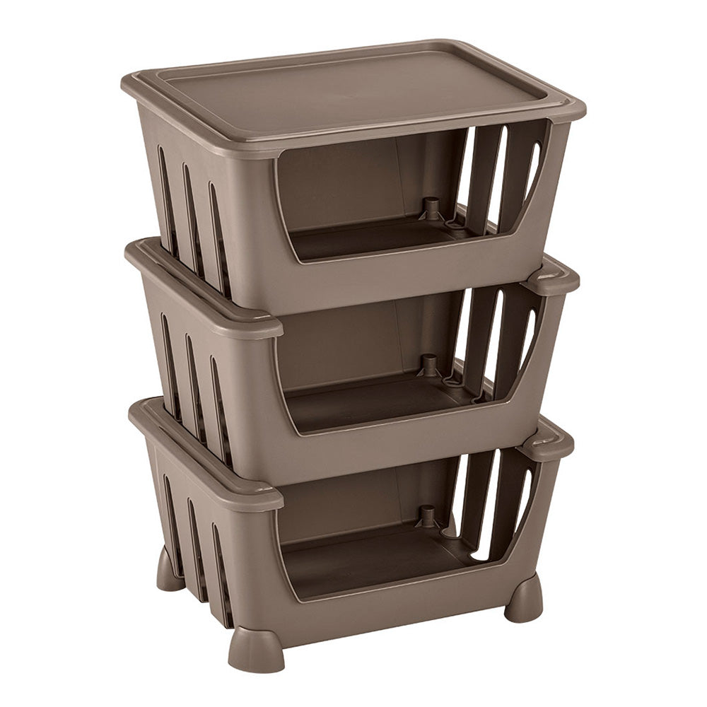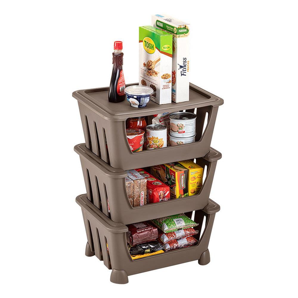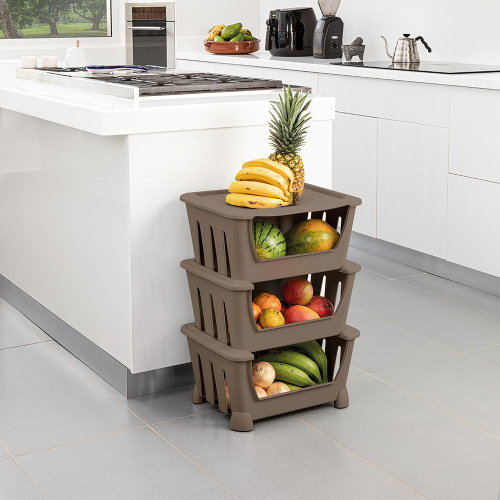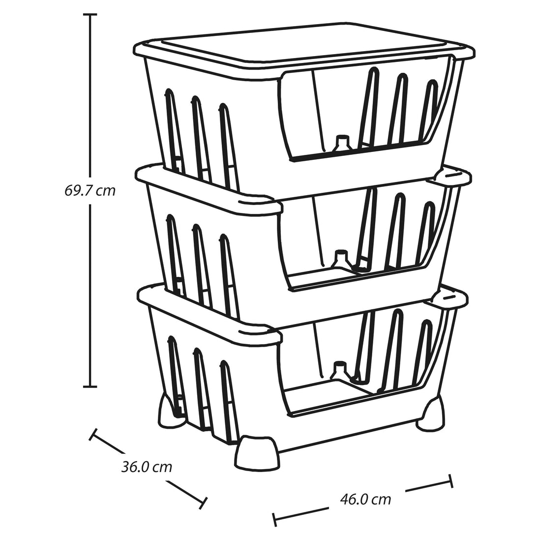 Canasta Organizadora que ayuda a organizar y optimizar el espacio de tu cocina, con tres niveles y una bandeja superior que da una superficie adicional . Cada canasta soporta 15 kg. Tiene tacones para elevar la canasta del piso.