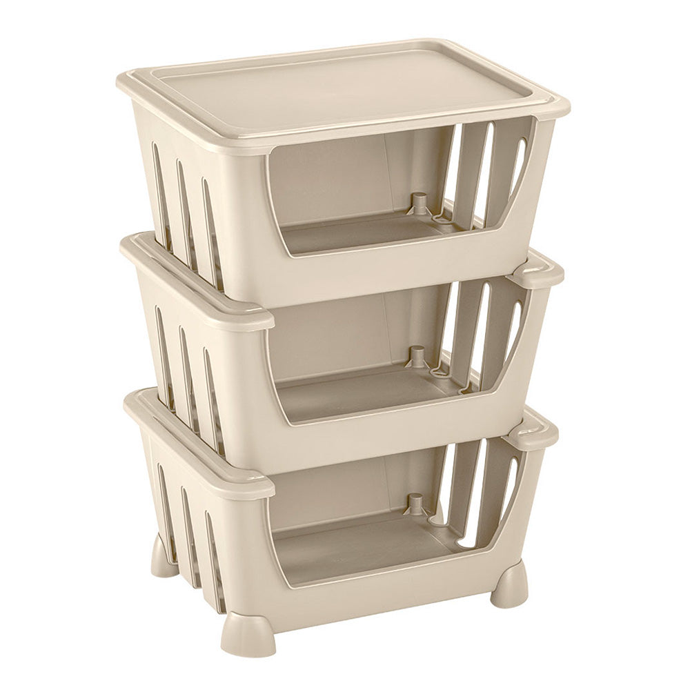 Canasta Organizadora que ayuda a organizar y optimizar el espacio de tu cocina, con tres niveles y una bandeja superior que da una superficie adicional . Cada canasta soporta 15 kg. Tiene tacones para elevar la canasta del piso.