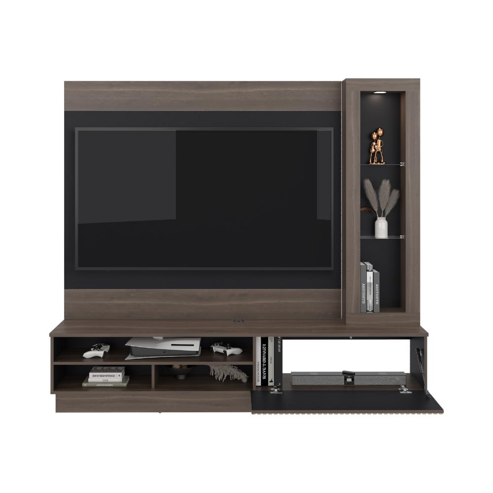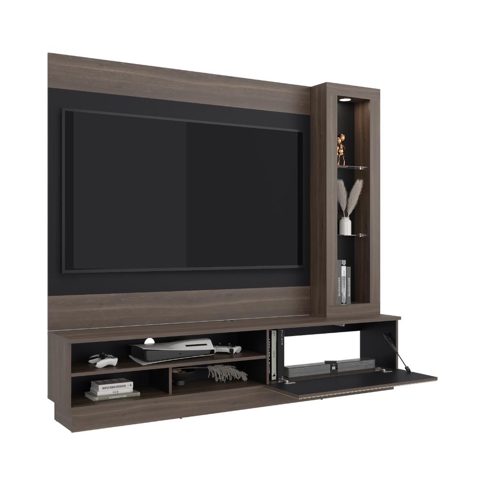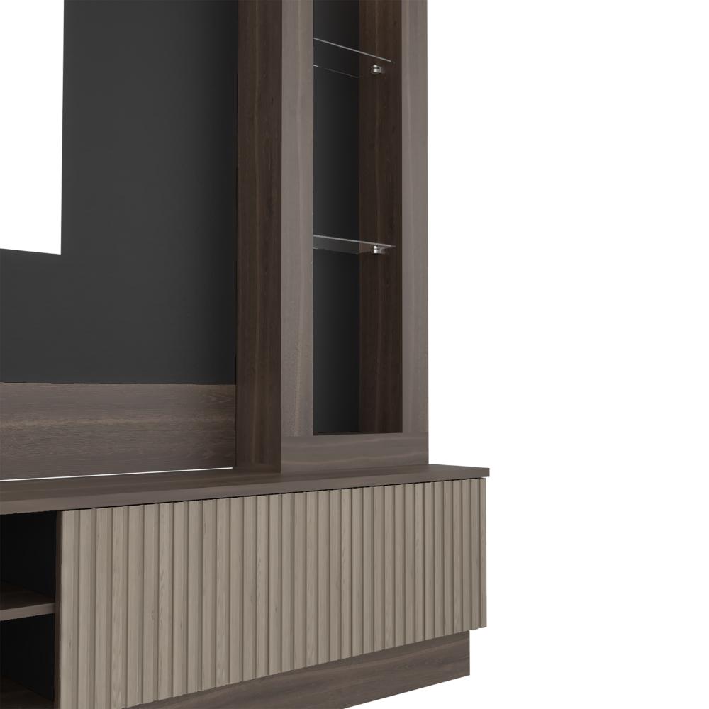 Centro de Entretenimiento para TV de hasta 65'' con sistema de iluminación, compartimentos para objetos decorativos, una puerta batiente, combinación de colores, entrepaño de vidrio.