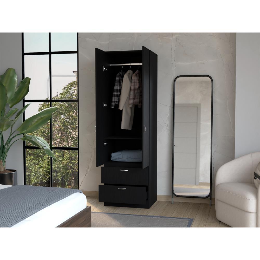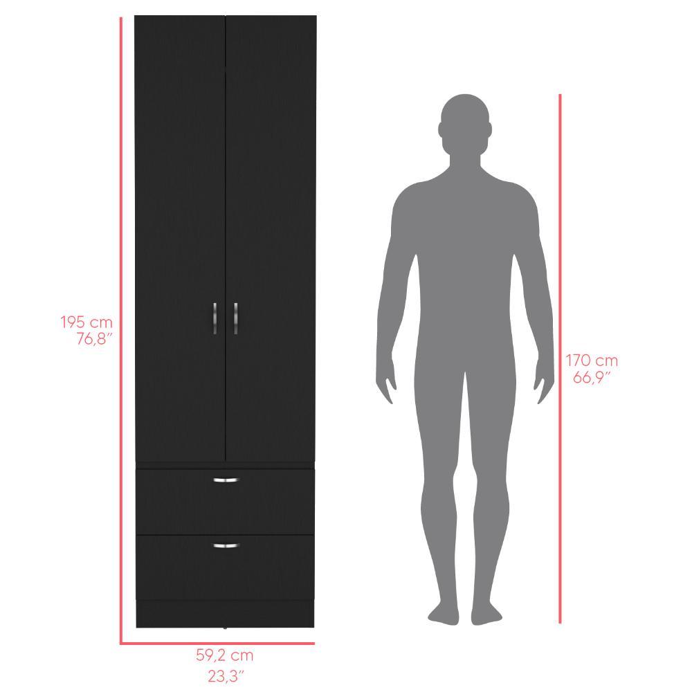 Closet, con 2 puertas dos cajones, manijas metálicas, debe ser anclado a la pared incluye los elementos para hacerlo, espacio para colgar ropa.