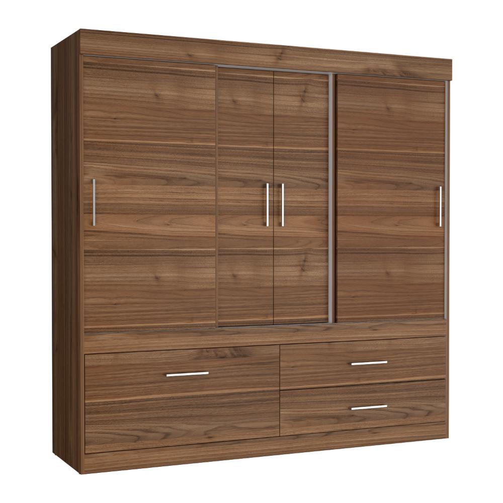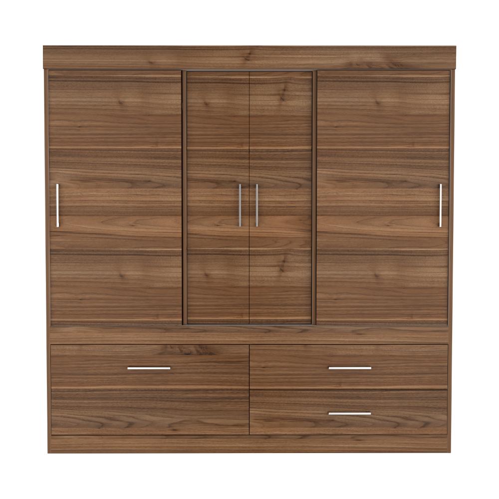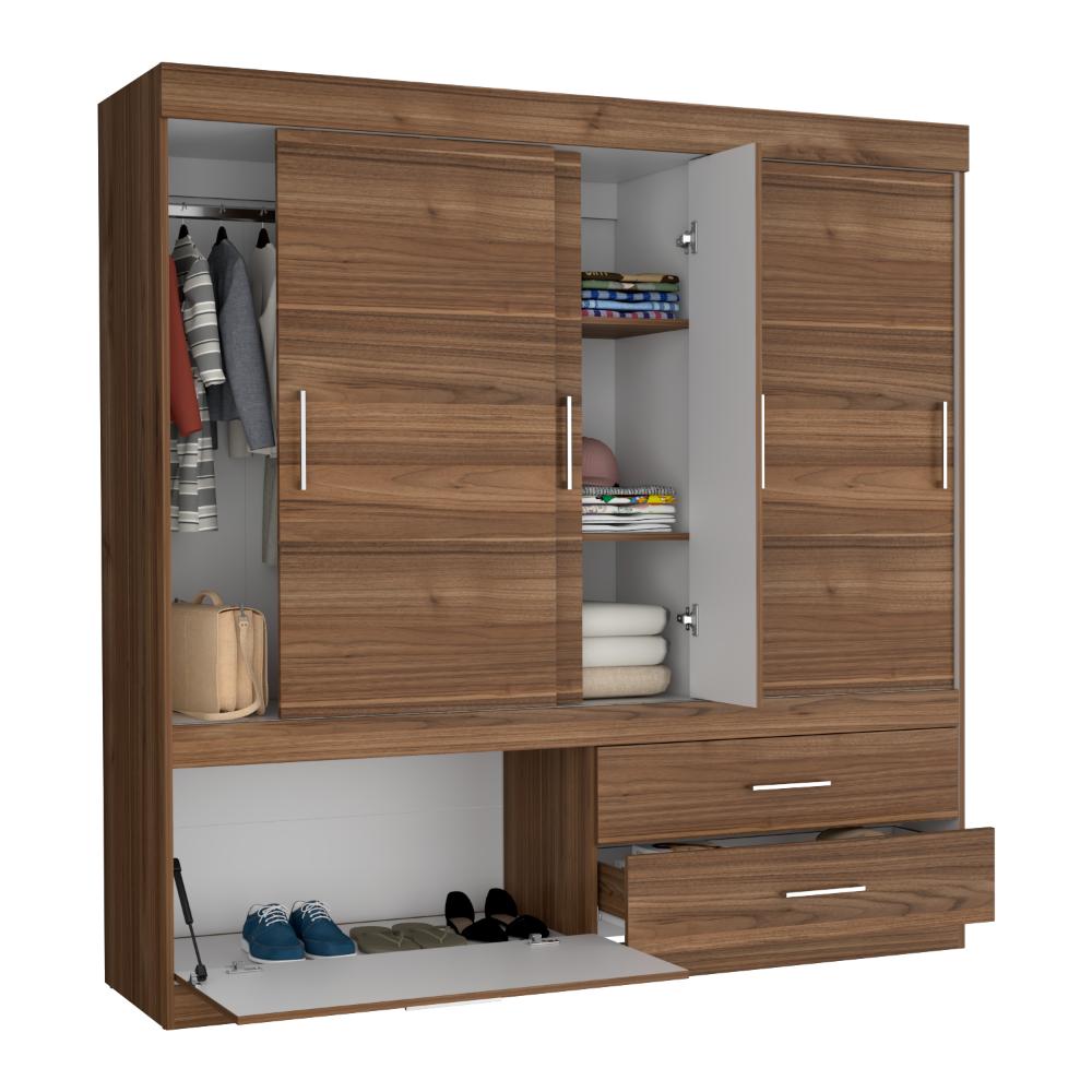 Closet, con 2 cajones, tubos cromados para colgar ropa, 2 puertas corredizas y 3 abatibles con manijas metálicas.