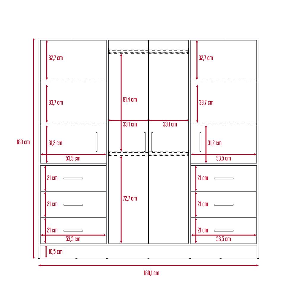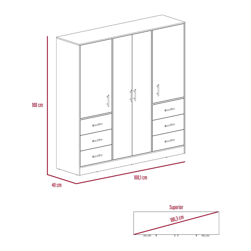 Closet, con 2 tubos cromados, 4 puertas batientes, 6 entrepaños, 6 cajones organizadores.