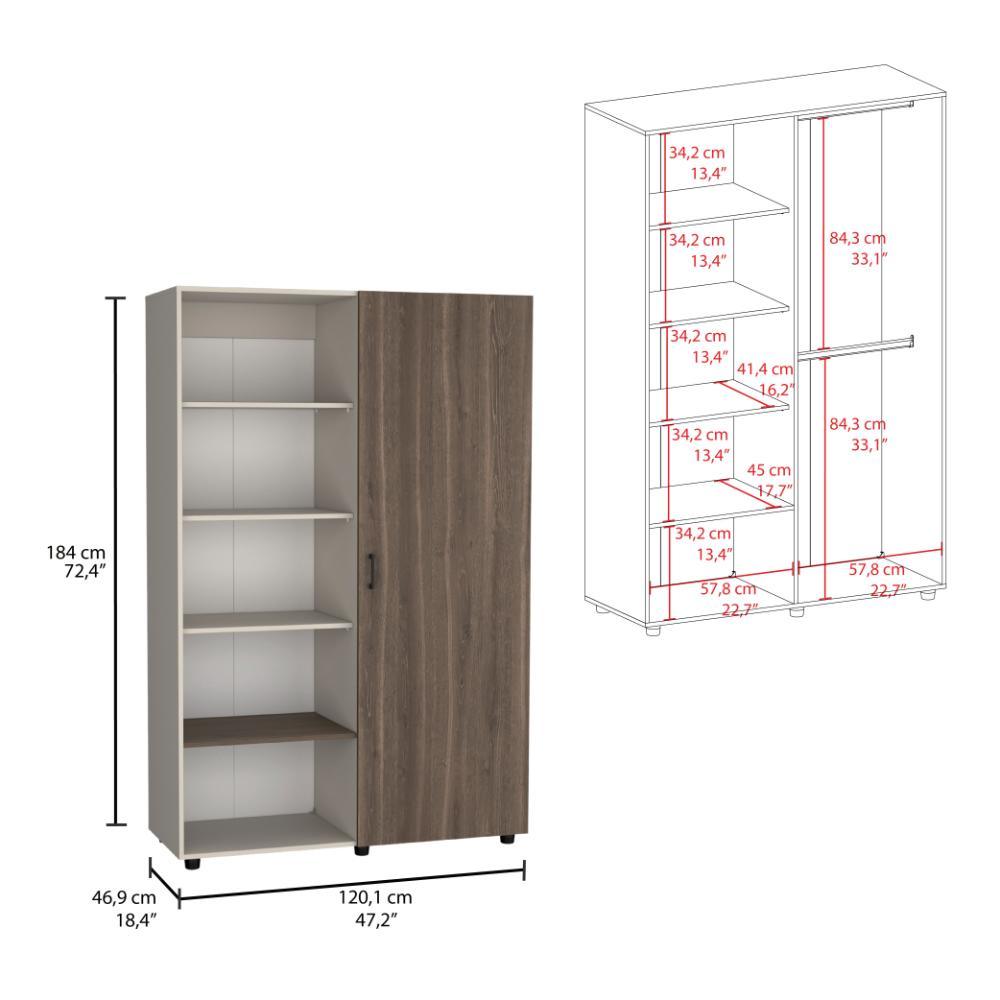 Closet, con una puerta batiente, dos tubos para colgar ropa, amplios espacios para guardar ropa.