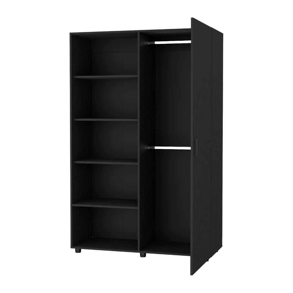 Closet, con una puerta batiente, dos tubos para colgar ropa, amplios espacios para guardar ropa.