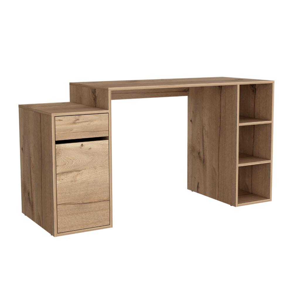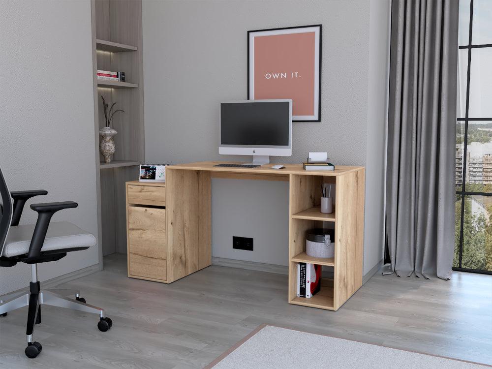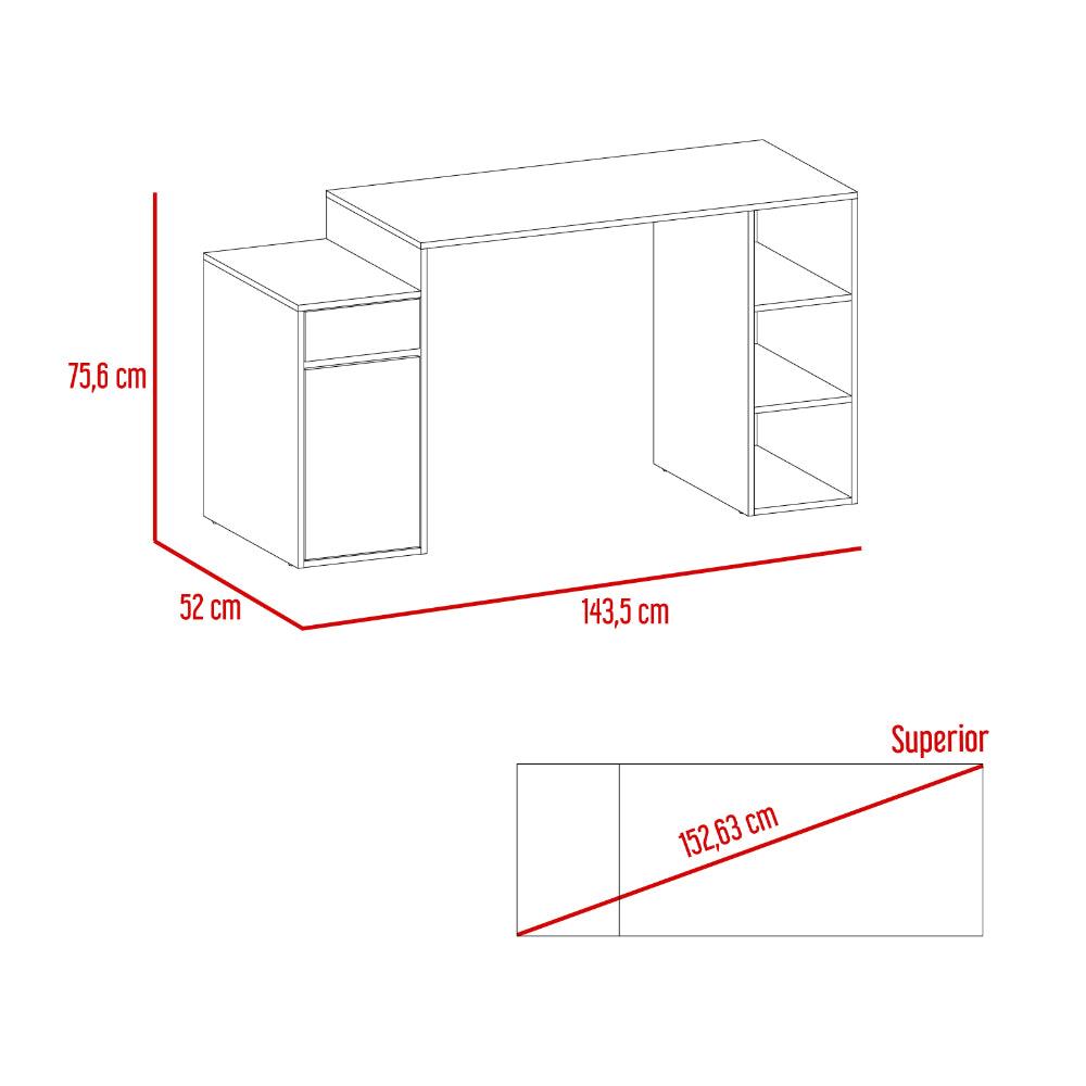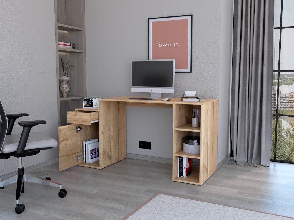 Escritorio, con amplia superficie en la mesa, una puerta abatible, un cajón, compartimientos para objetos de estudio y/o decorativos.