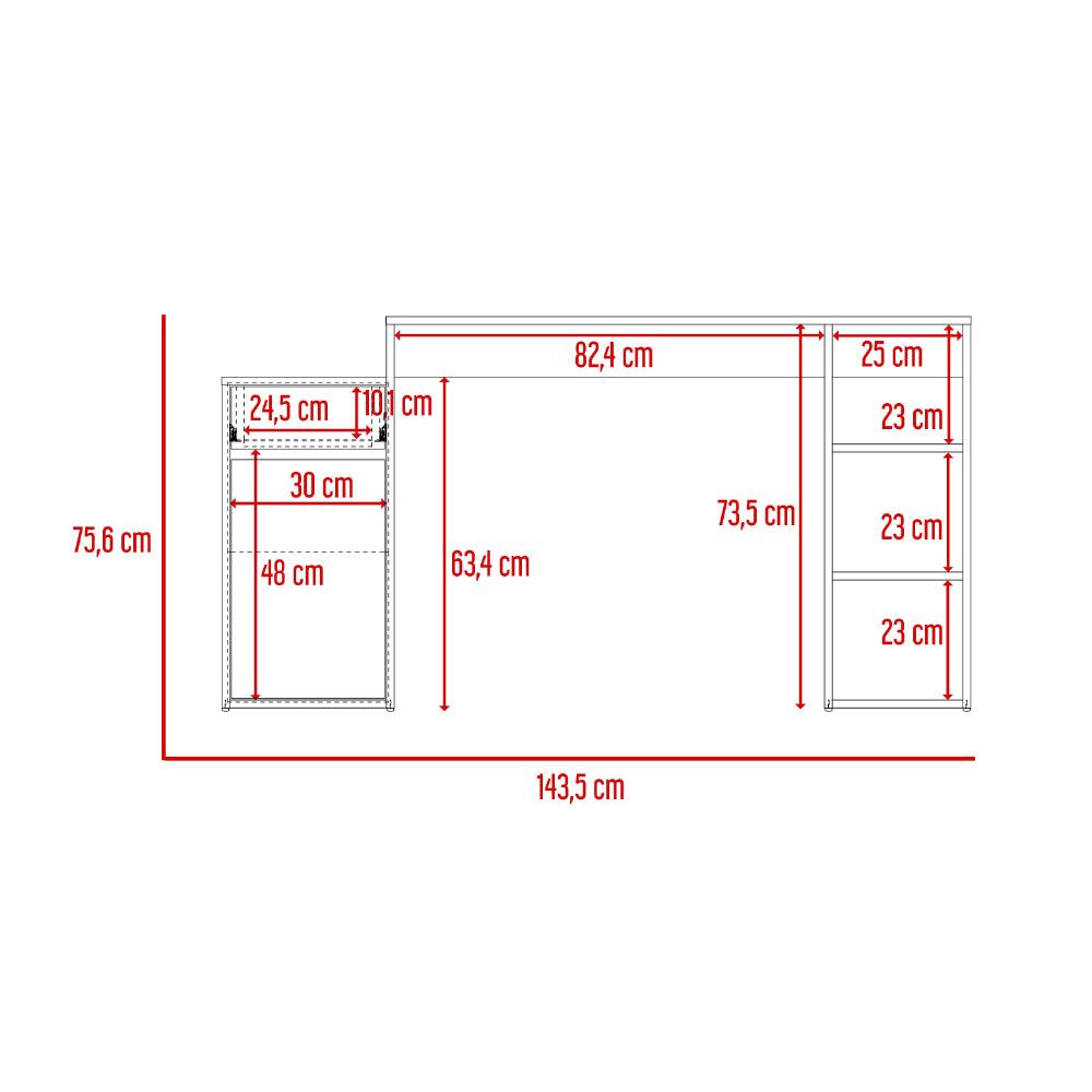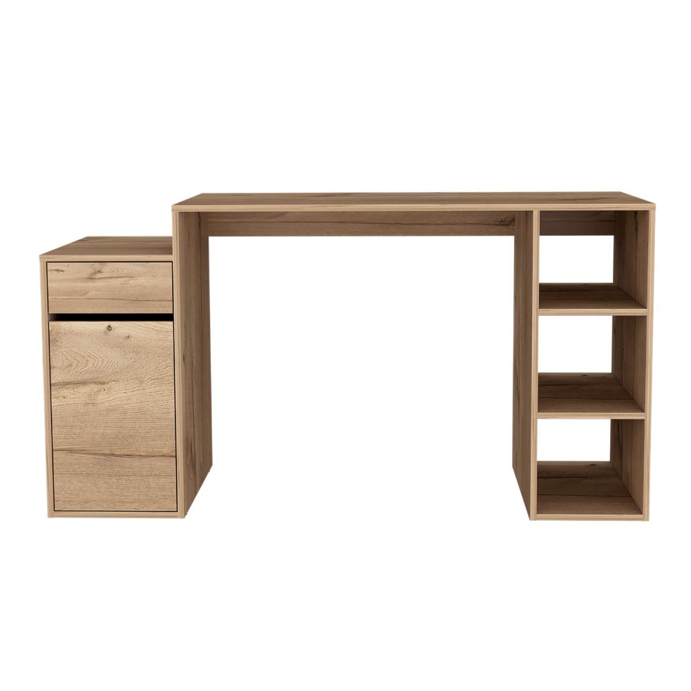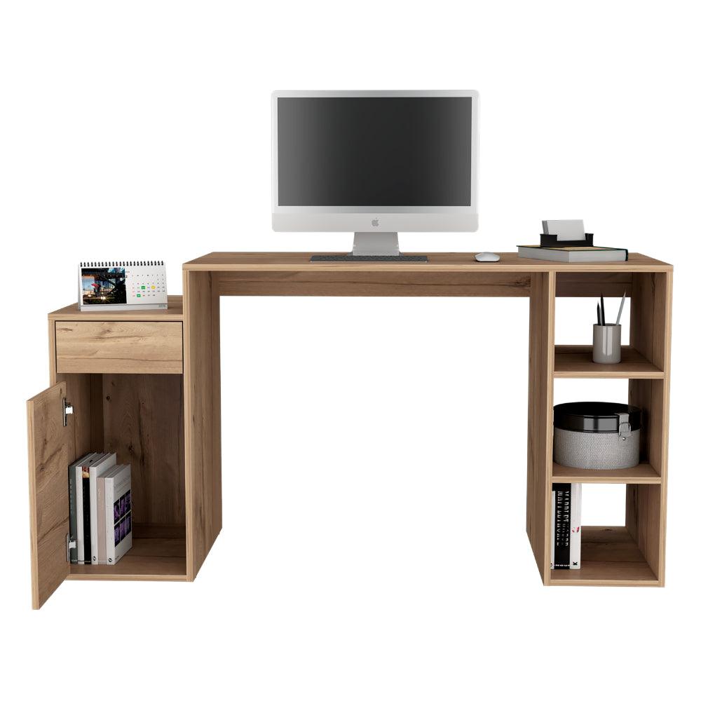 Escritorio, con amplia superficie en la mesa, una puerta abatible, un cajón, compartimientos para objetos de estudio y/o decorativos.