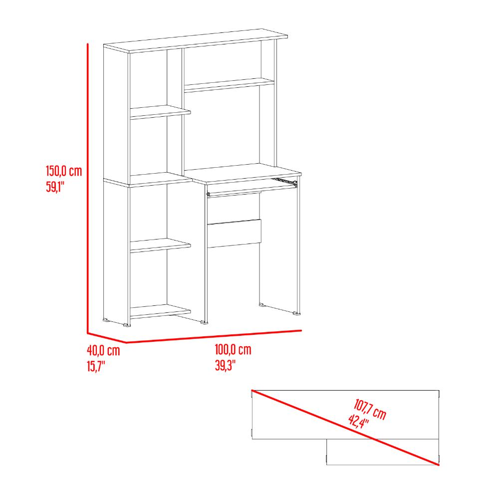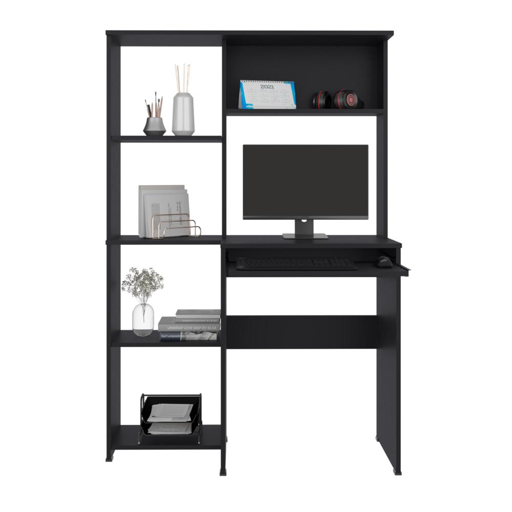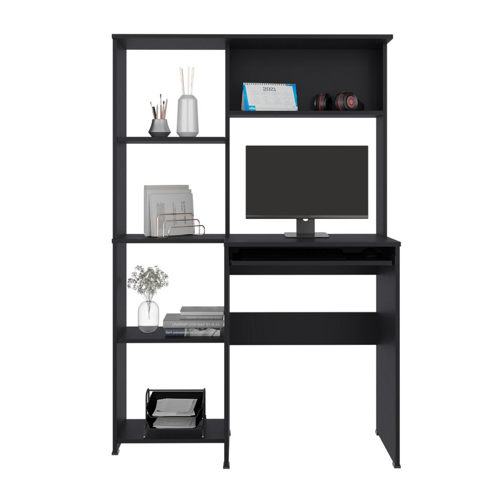 Escritorio, con entrepaños para colocar libros u objetos, badeja movil para teclado, es de facil instalación.