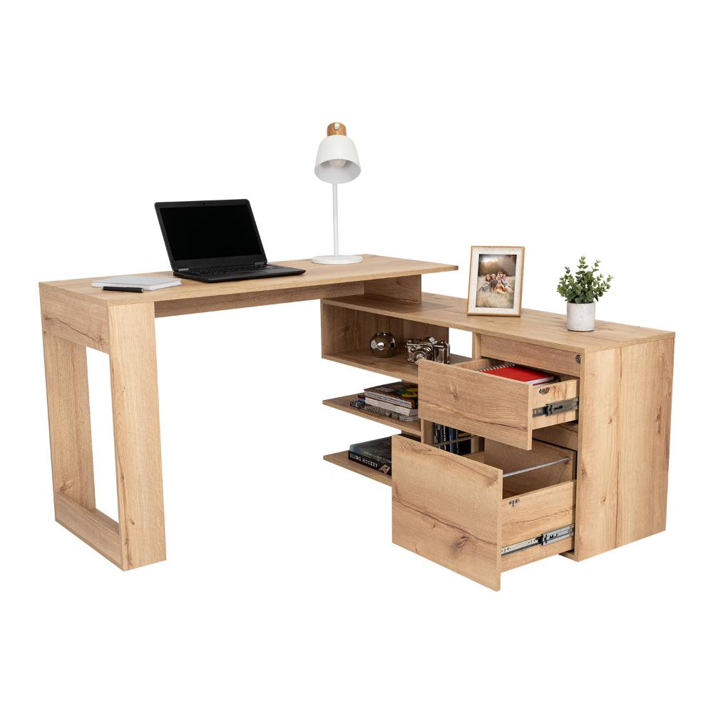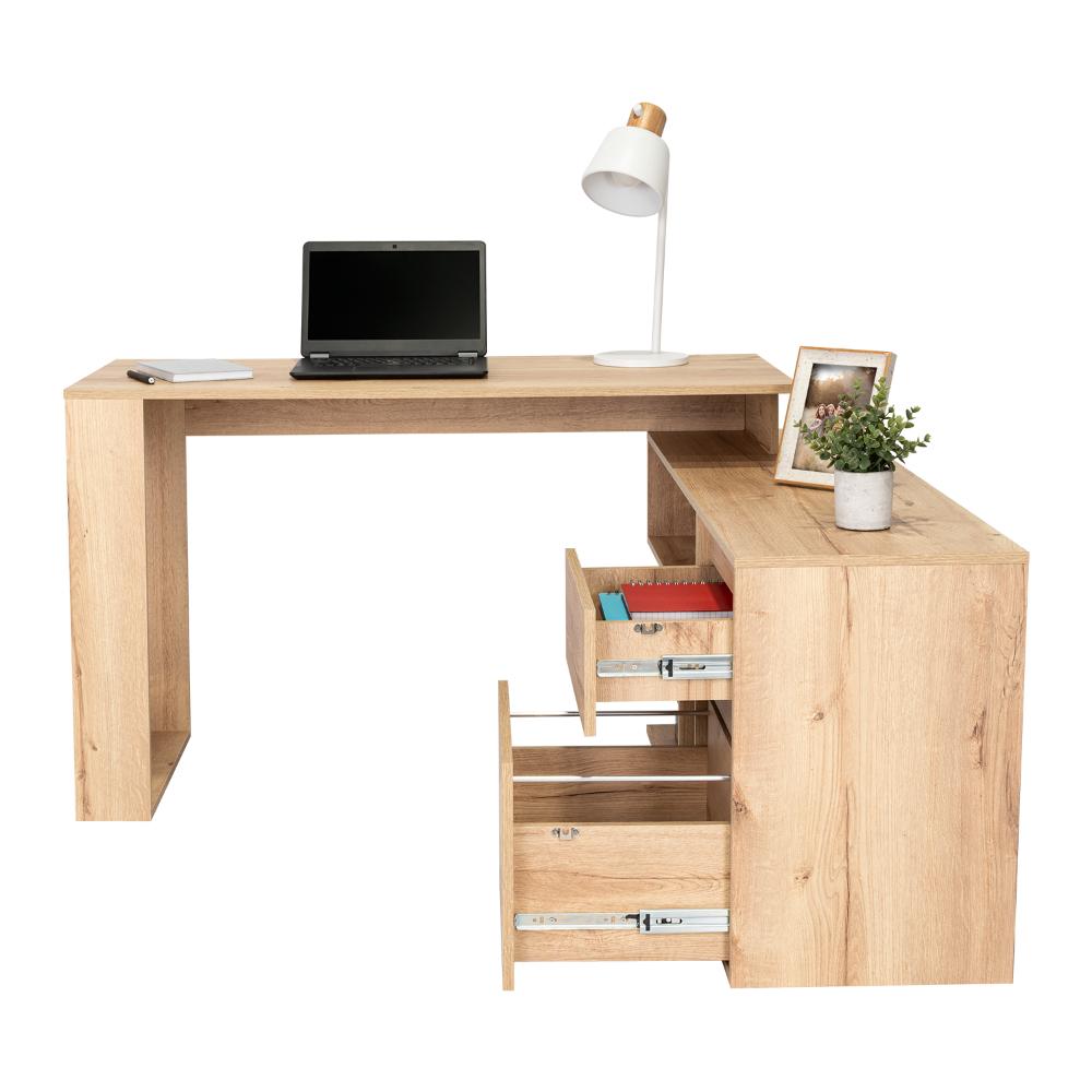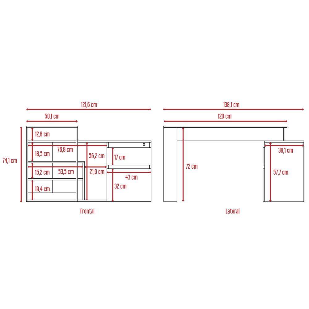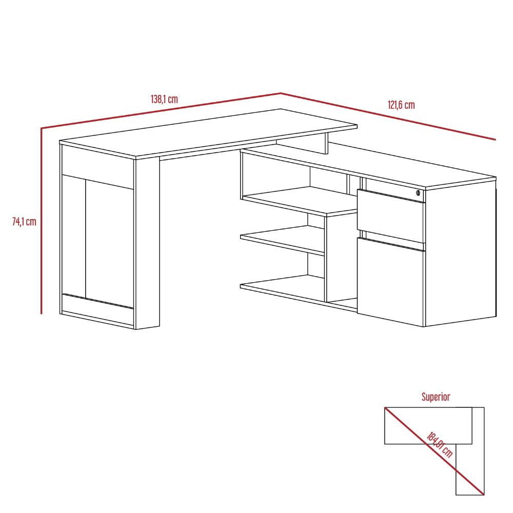 Escritorio en L, con 1 cajón organizador, 1 cajón archivador, variedad de entrepaños y amplio espacio de trabajo.