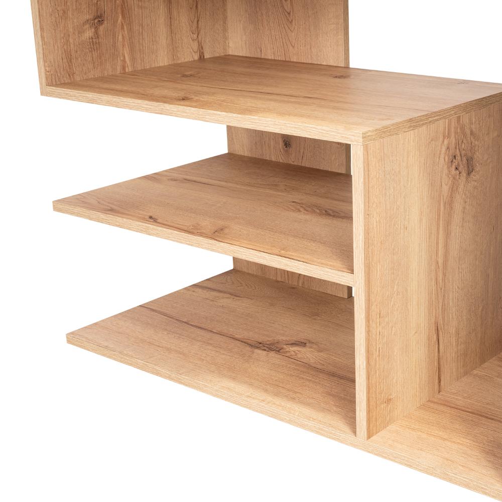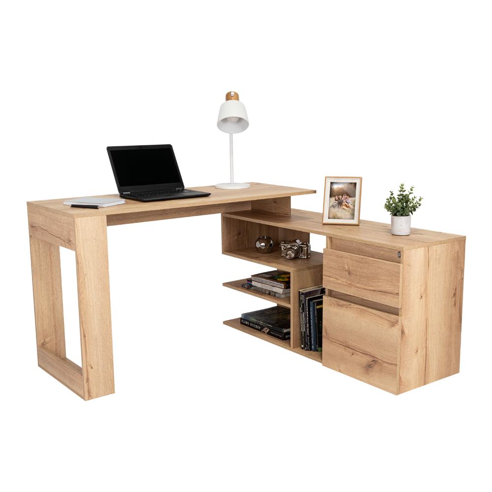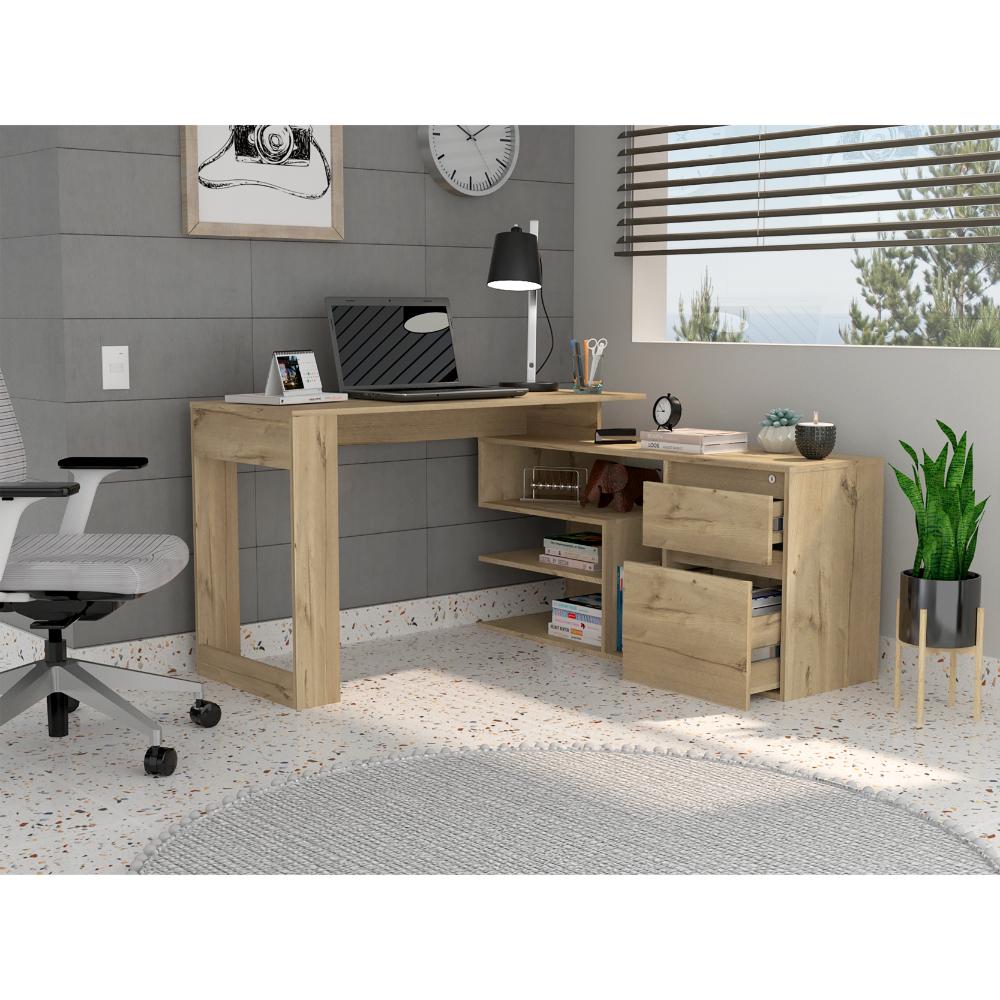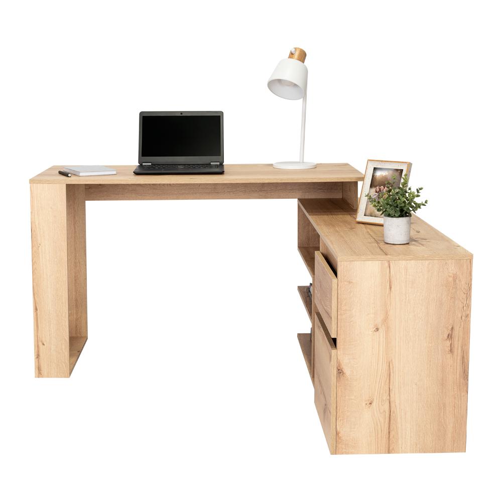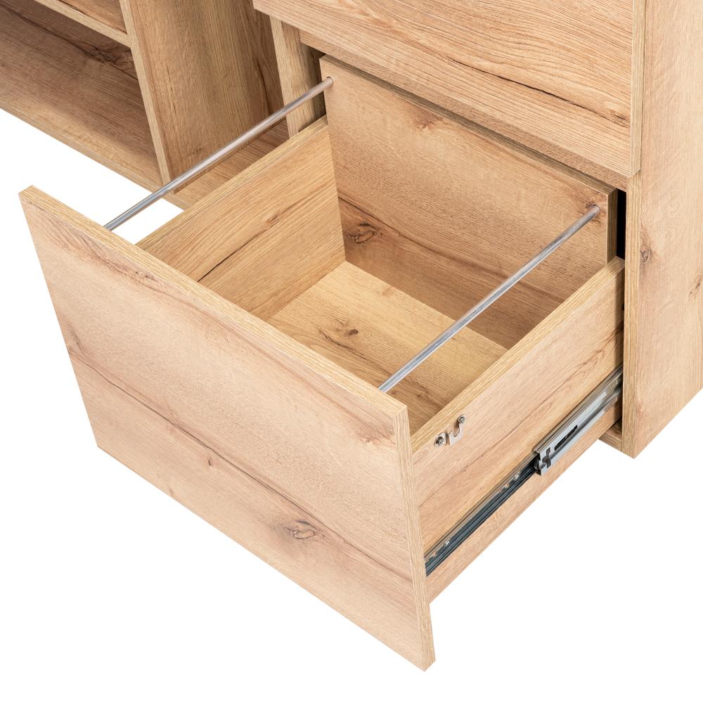 Escritorio en L, con 1 cajón organizador, 1 cajón archivador, variedad de entrepaños y amplio espacio de trabajo.