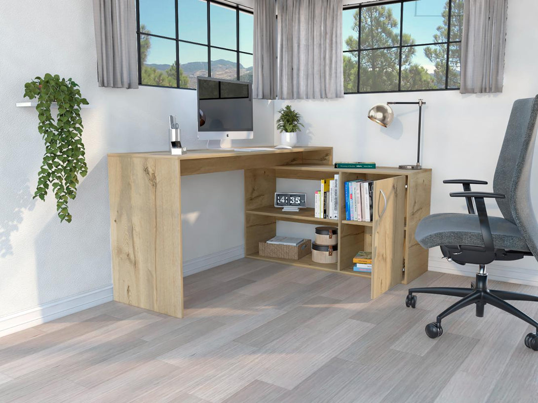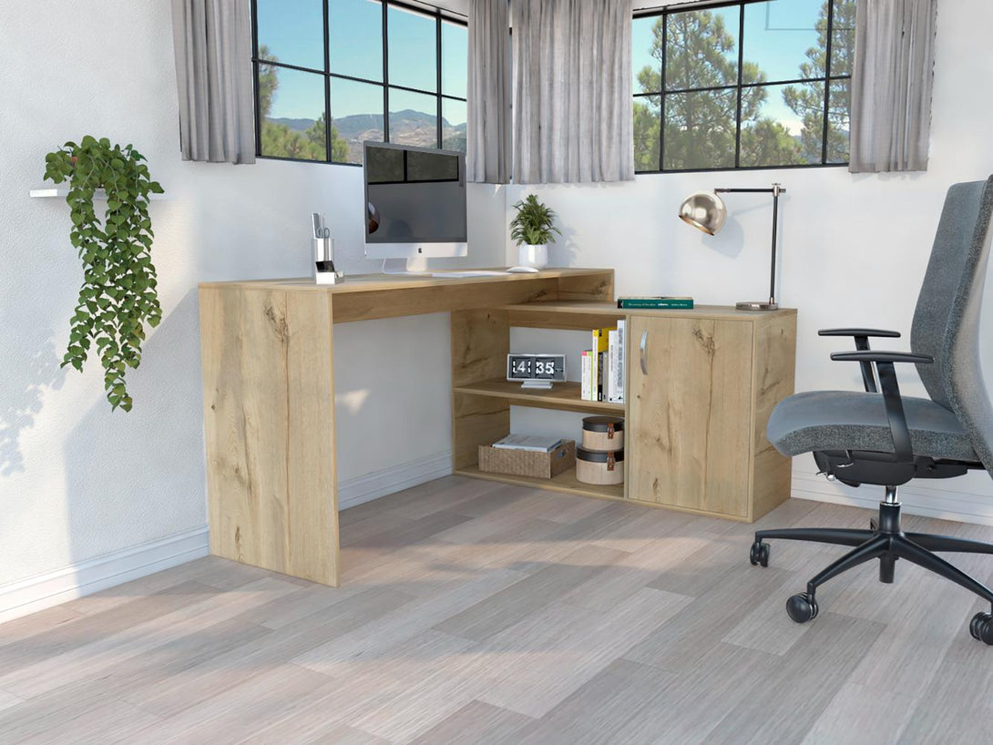 Escritorio en L, con espacio con puerta batiente para almacenar libro u otro, y