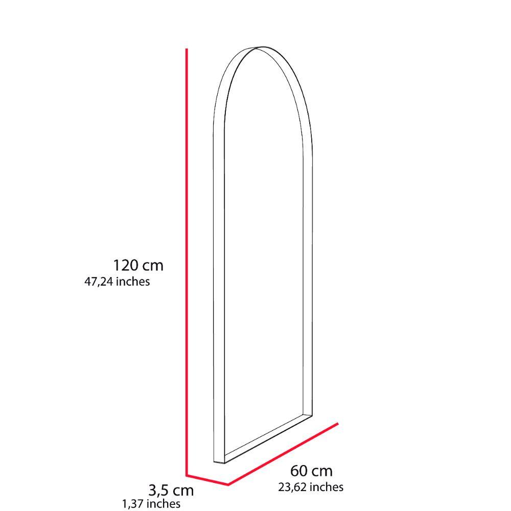 Espejo rectangular con el extremo superior curvo y en estructura metálica ensamble a pared con chaflan. Incluye herrajes para su instalación