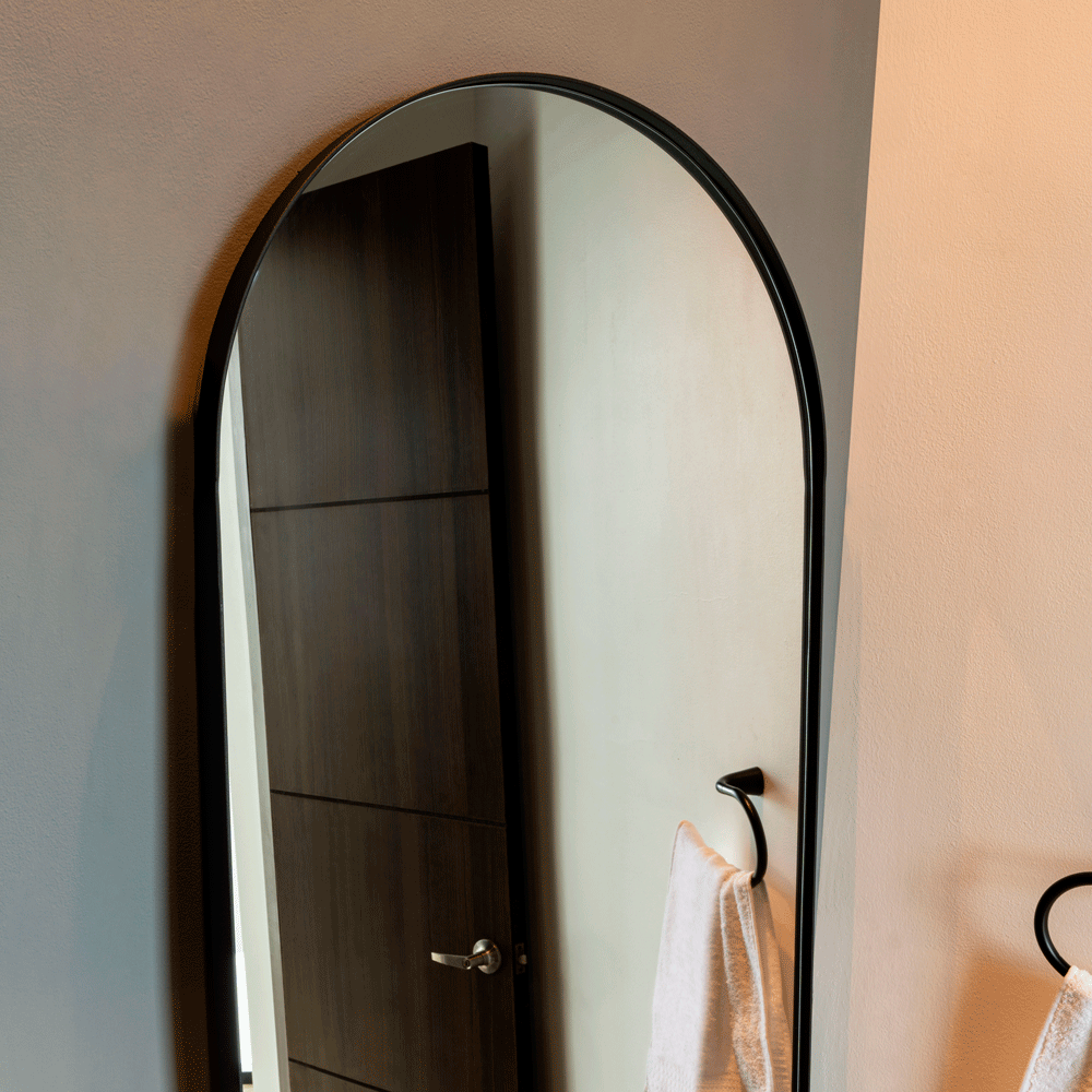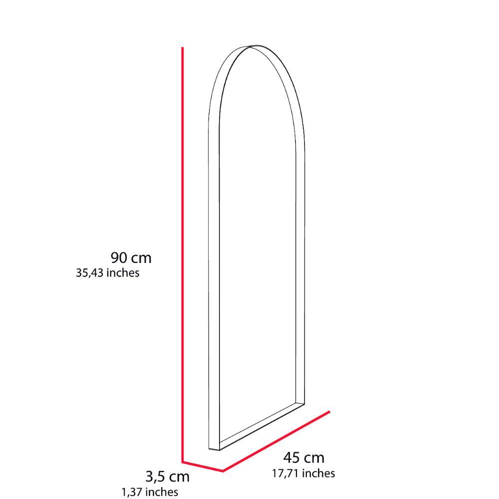 Espejo rectangular con el extremo superior curvo y en estructura metálica ensamble a pared con chaflan. Incluye herrajes para su instalación.