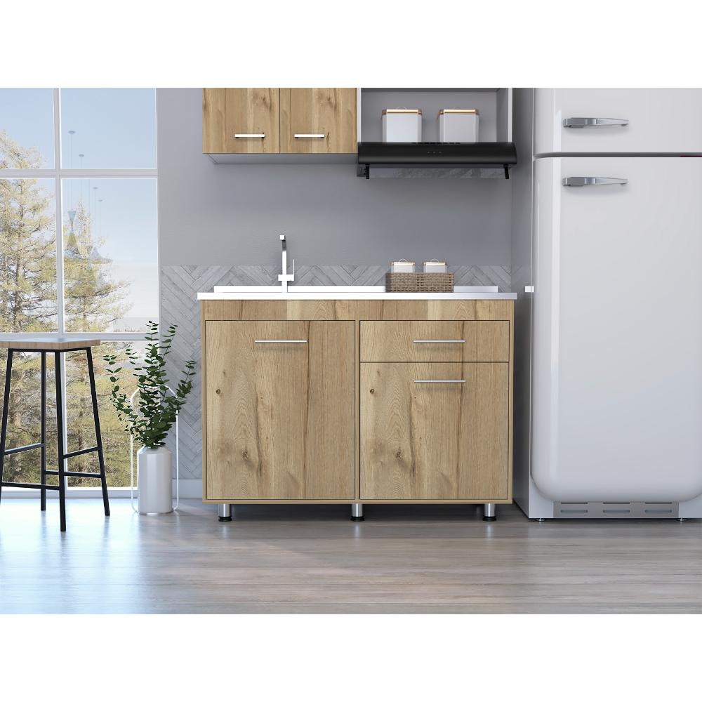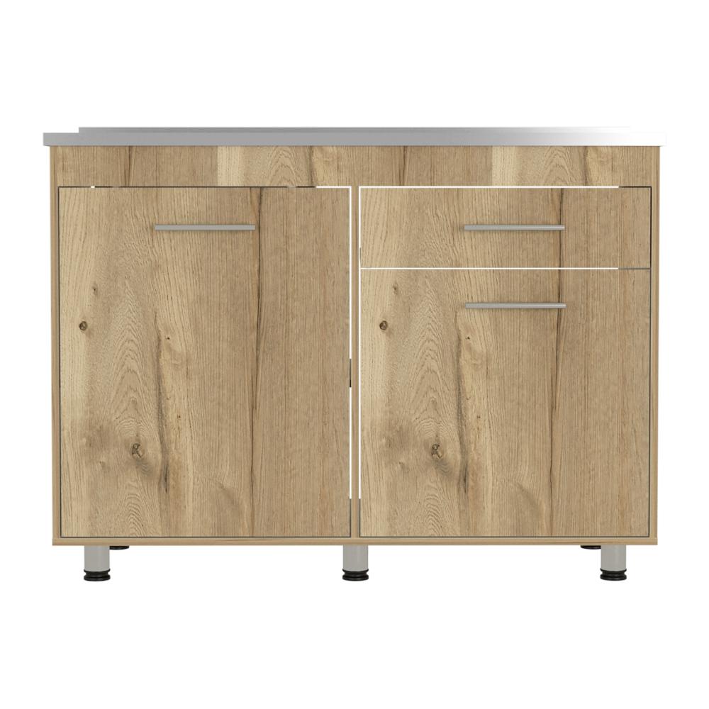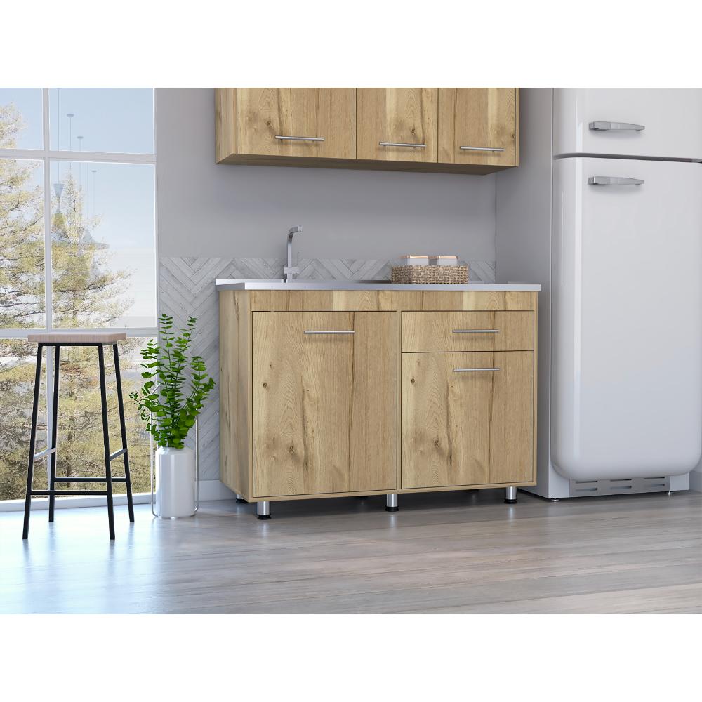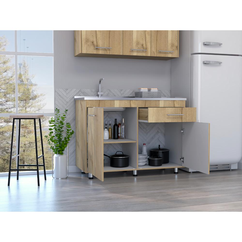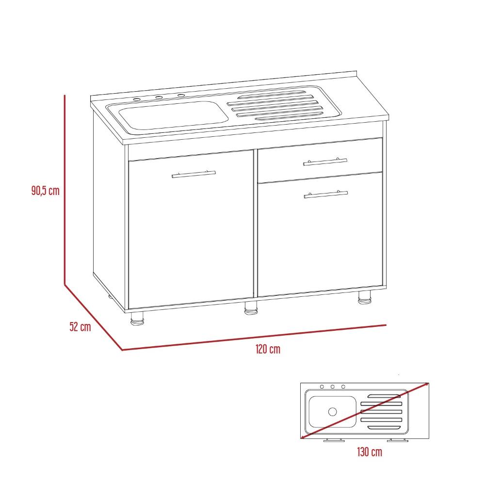 Gabinete Inferior incluye meson izquierdo, manijas metálicas ,dos puertas abatibles y un cajón