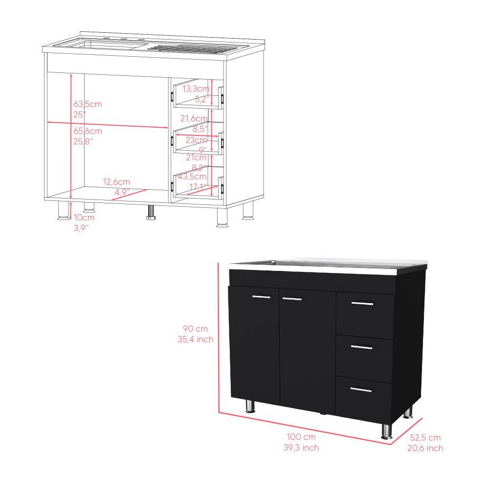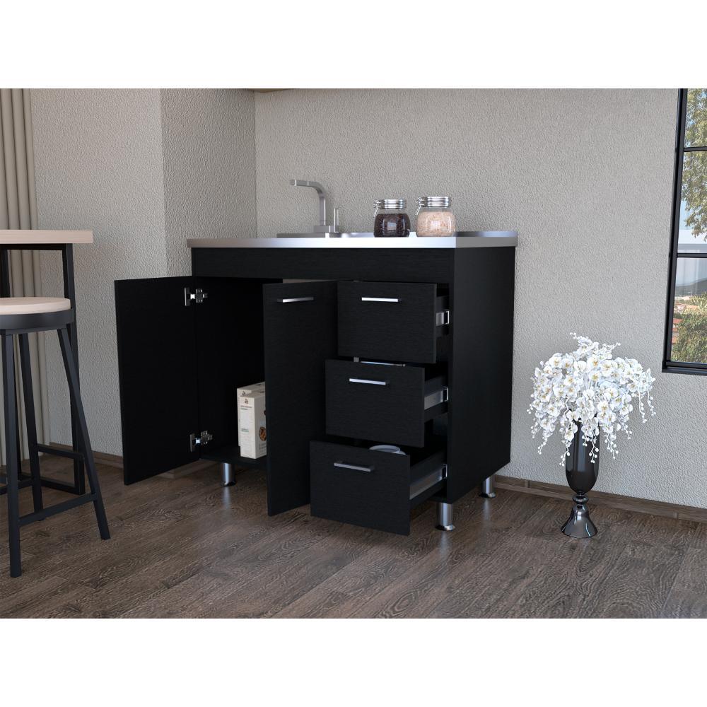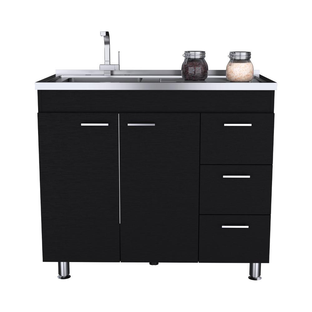 Gabinete Inferior, con dos puertas batientes, tres cajones deslizables, manijas y patas metálicas, con Mesón Izquierdo.