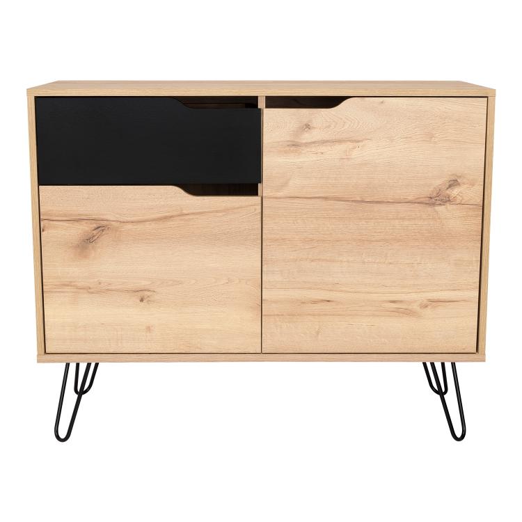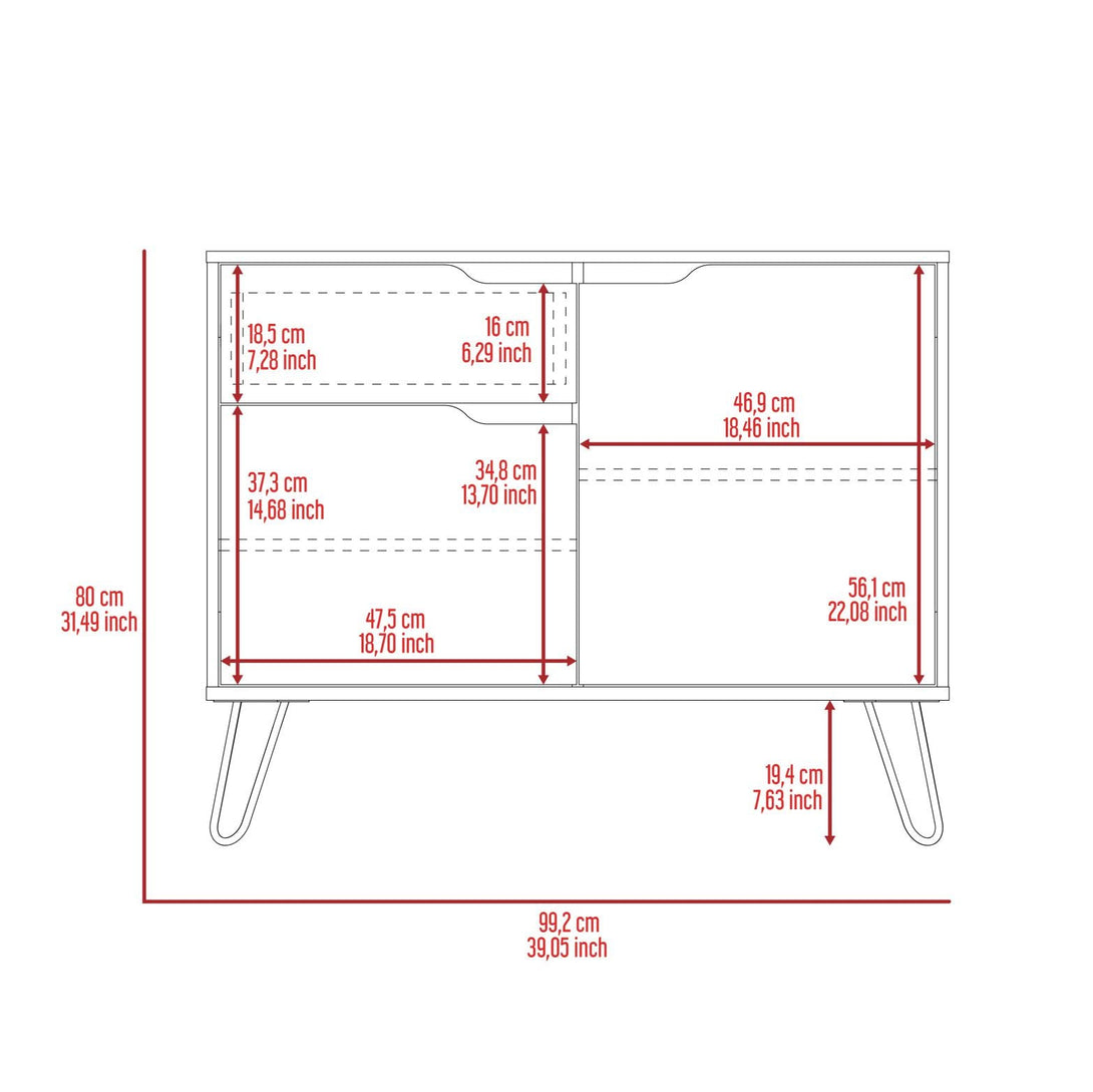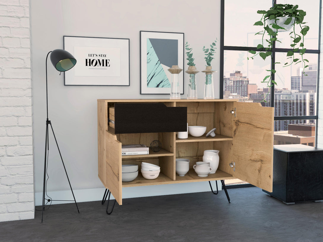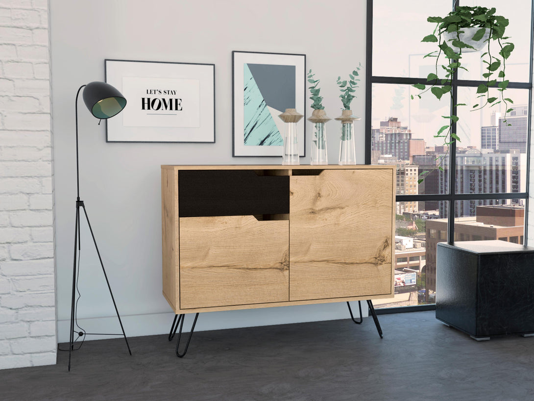 Mesa Auxiliar Recibidor, con 2 puertas, diseño moderno con combinación de colores, un cajón de extensión total y apertura sin manija, patas metálicas y amplio espacio.