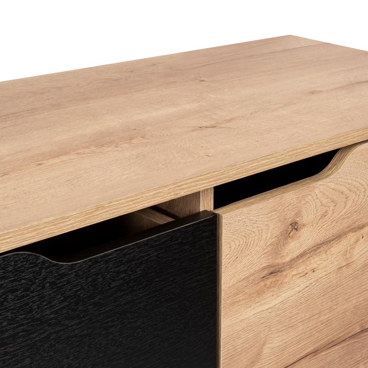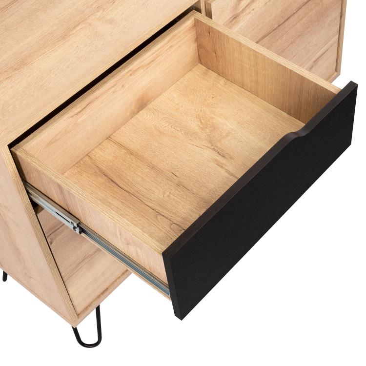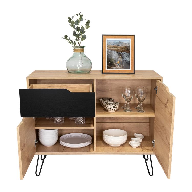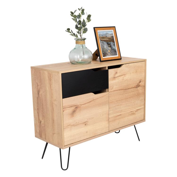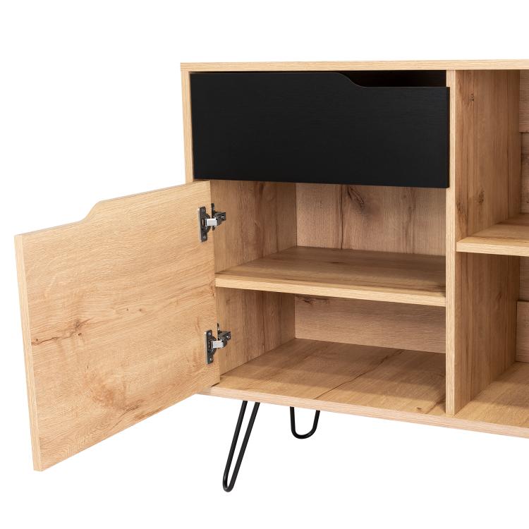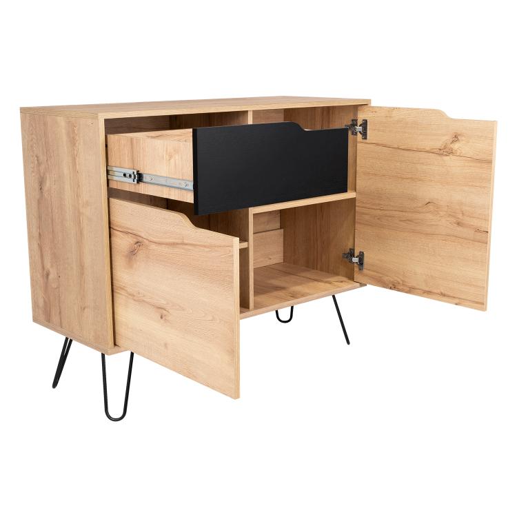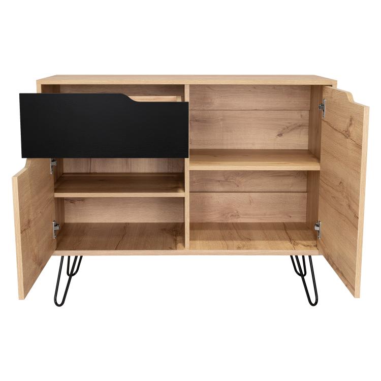 Mesa Auxiliar Recibidor, con 2 puertas, diseño moderno con combinación de colores, un cajón de extensión total y apertura sin manija, patas metálicas y amplio espacio.