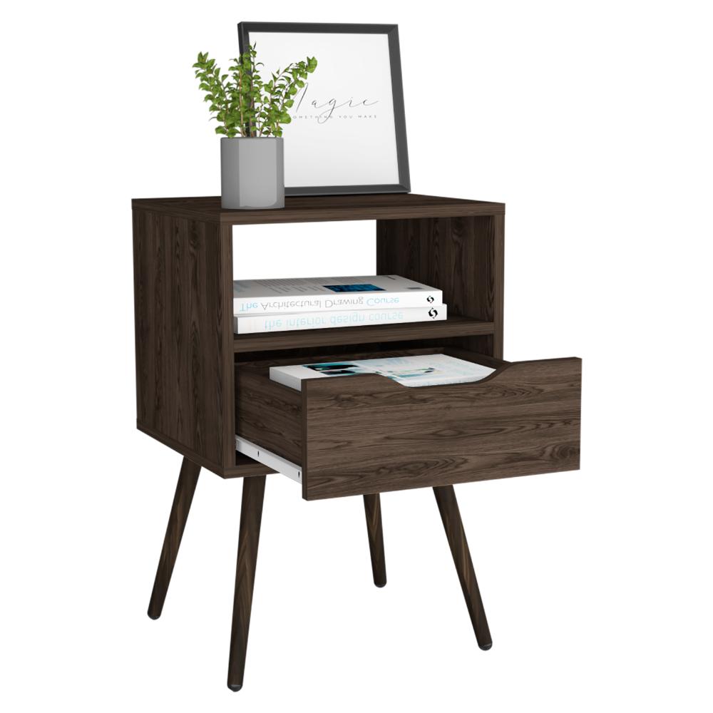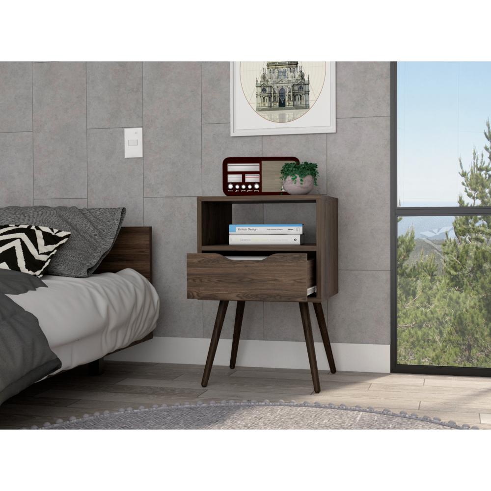 Mesa de Noche Alesio, Chocolate, con Patas en Madera y un Cajón ZF