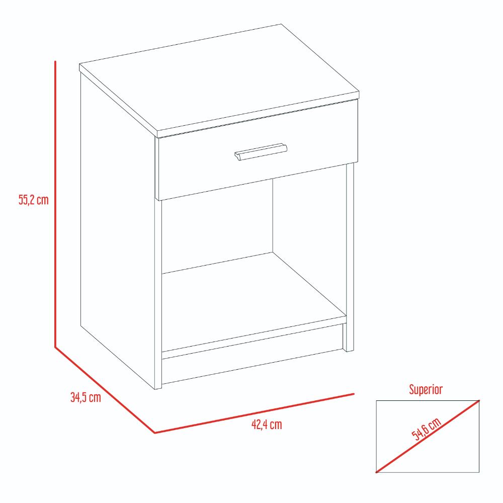 Mesa de Noche, con superficies para ubicar pertenencias, cajon para almacenar, y espacio para lámpara de mesa.