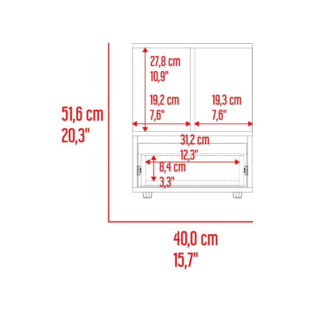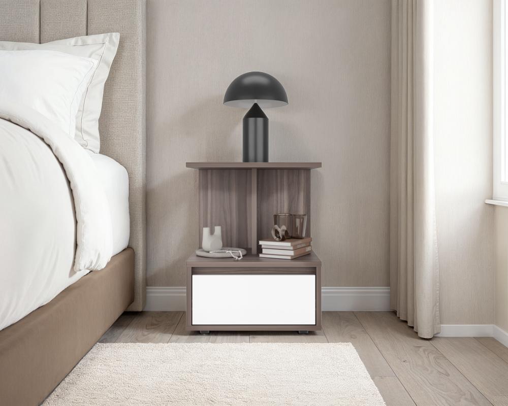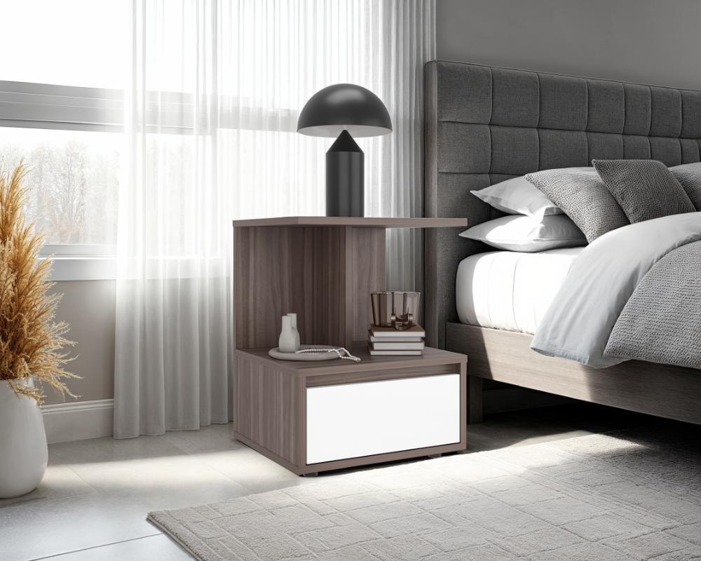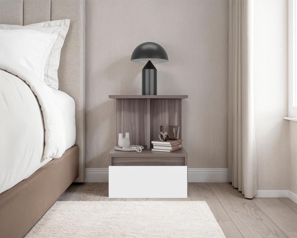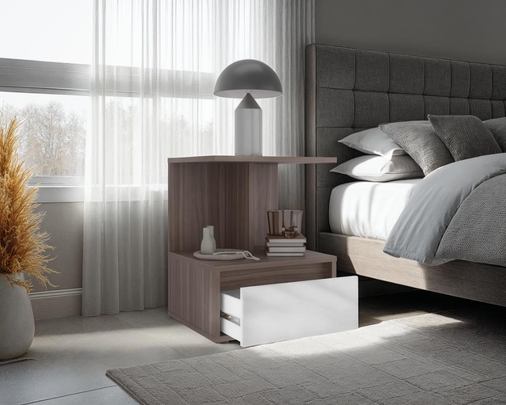 Mesa de Noche Mike, Avellana y Blanco Duqueza, con un cajon multiusos