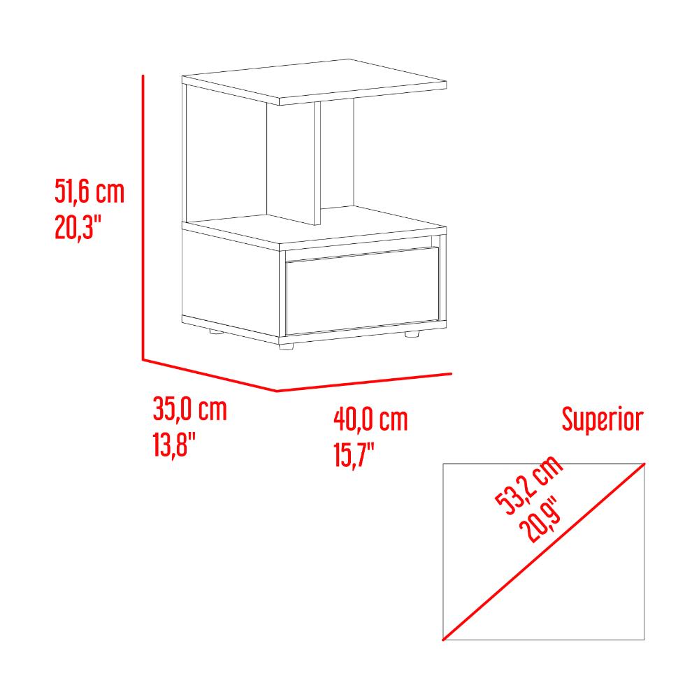 Mesa de Noche, cuenta con 1 cajón multisuos, espacio para colocar objetos decorativos, combinación de colores y es de facil instalación.