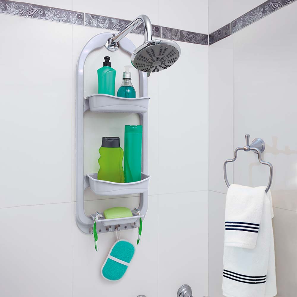 Tres entrepaños con el tamaño ideal de los envases. Bandejas mas profundas y con mayor altura y perforaciones que permiten filtrar el agua y facilitan la limpieza. Adaptador que facilita instalar en cualquier tamaño de grifo ; pared o ducha; se puede retirar o dejar a la preferencia. Jabonera con drenaje y espacio para rasuradora. 4 ganchos para colgar accesorios de ducha.