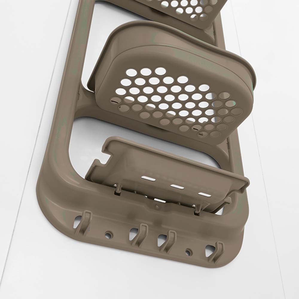 Tres entrepaños con el tamaño ideal de los envases. Bandejas mas profundas y con mayor altura y perforaciones que permiten filtrar el agua y facilitan la limpieza. Adaptador que facilita instalar en cualquier tamaño de grifo ; pared o ducha; se puede retirar o dejar a la preferencia. Jabonera con drenaje y espacio para rasuradora. 4 ganchos para colgar accesorios de ducha.