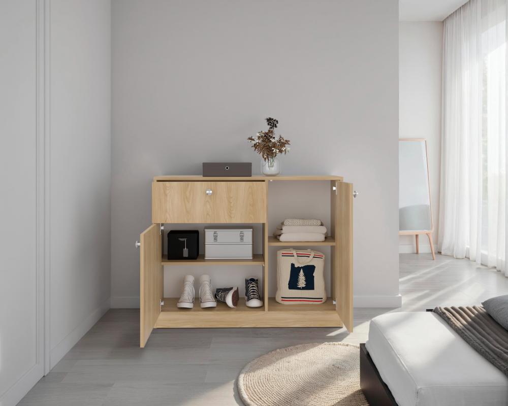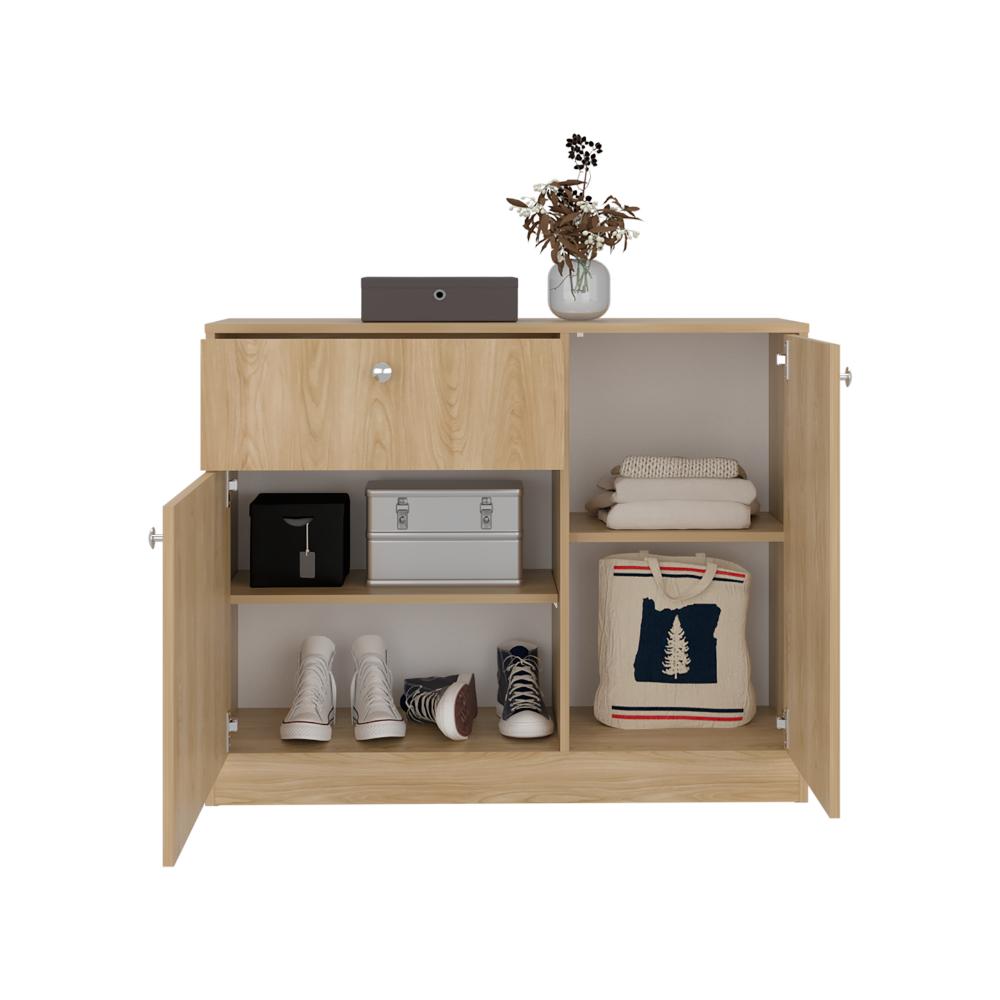 Organizador, cuanta con 2 puertas abatibles, 1 cajon multiusos, 2 entrepaños divisores, deslizadores en U para una facil movilidad, espacio para ubicar objetos, y es de facil instalatación.