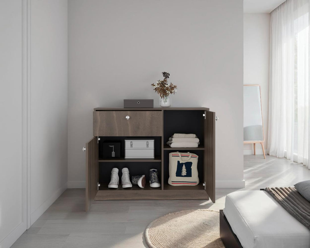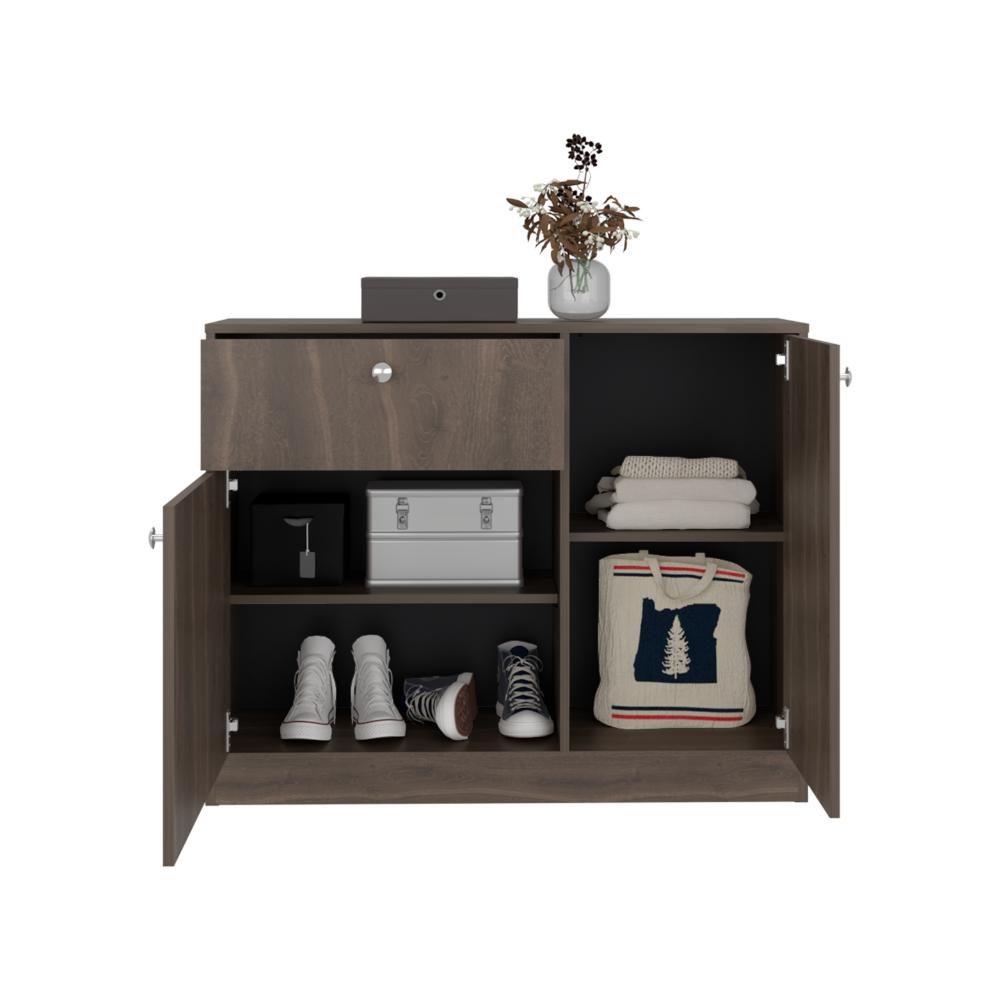 Organizador, cuanta con 2 puertas abatibles, 1 cajon multiusos, 2 entrepaños divisores, deslizadores en U para una facil movilidad, espacio para ubicar objetos, y es de facil instalatación.