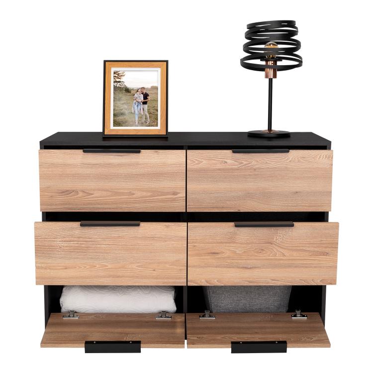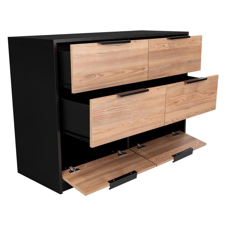 Organizador, con 4 cajones multiusos deslizables con manijas negras, 2 puertas abatibles en la parte inferior.